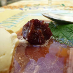 特徴的な「地方菓子」としてはrestaurantのdessetであった「Poire Tapées」直訳すると「熟れすぎた洋梨、叩かれた洋梨」です。これは乾燥させてpoireをChinon rougeシノン産赤ワインで漬けたものです。菓子屋では「La Tarte du vignoble」というものがありました。これは薄く焼いたfeuilletqgeに薄切りリンゴを乗せて焼き、仕上げにvin rouge赤ワインのgeléeジュレを塗ったものです。