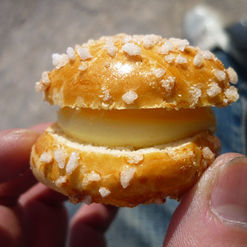 そんな彼女によって命名され(結局は違う名前に落ち着きましたが)、PACAはもとより、フランス各地で見られるspécialitéとなったものが「Tarte Tropézienne(B.B.はTarte de Saint Tropezと名付けたらしい)」です。これはPolonaisポーランド人のAlexandre Mickaというpâtissierが作ったものです。この菓子を映画の撮影でこの地を訪れていたB.B.一行に振る舞ったということです。この菓子はPACAの例に習ってeau de fleur d’orangerを効かせたbriocheブリオッシュを平たくして上にsucre grain粗い砂糖をふって焼き、それを等分したものに(ここ本場ではimbibage(水分をしみ込ませること)はなしです。他では主にkirschキルシュ酒(サクランボの蒸留酒)をsiropシロップで割ったももをうちます)crèmeクリームをgarni(詰める)します。このcrèmeはcrème au beurreバター・クリームとcrème pâtissièreカスタード・クリームを合わせたもの、と書いてある本もありましたが、この創始者の店で聞いた限り、「3種類のcrème」と言っていたので、おそらくこられにcrème fouettée泡立てた生クリームか何かを加えていると考えられます。